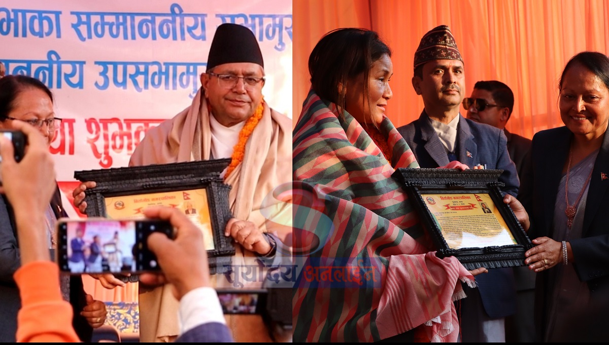 उहाँहरूलाई दोसल्ला ओडाएर तथा सम्मान पत्र प्रदान गरेर नगरप्रमुख पवित्रा महतारा प्रसाईंले सभामुख घिमिरे तथा उपसभामुख रानामगरलाई सम्मान गर्नुभएको हो ।