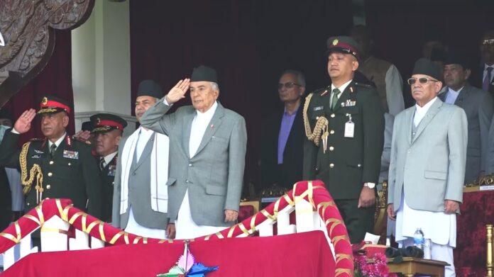समारोहमा नेपाली सेना, नेपाल प्रहरी र सशस्त्र प्रहरी बल नेपालद्वारा मार्चपास गर्नुका साथै सेना र सशस्त्र प्रहरीको संयुक्त टोलीले राष्ट्र र राष्ट्रियता उजागर गर्ने गीत-सङ्गीतका धुन प्रस्तुत गरेका थिए । समारोहमा राष्ट्रपति रामचन्द्र पौडेल , उपराष्ट्रपति रामसहायप्रसाद यादव, प्रधानमन्त्री पुष्पकमल दाहाल प्रचण्ड, कामुप्रधानन्यायाधीश हरिकृष्ण कार्की, सभामुख देवराज घिमिरे, राष्ट्रियसभा अध्यक्ष गणेशप्रसाद तिमिल्सिना, सवैधानिक निकायका प्रमुख लगाएको उपस्थीति रहेको थियो ।