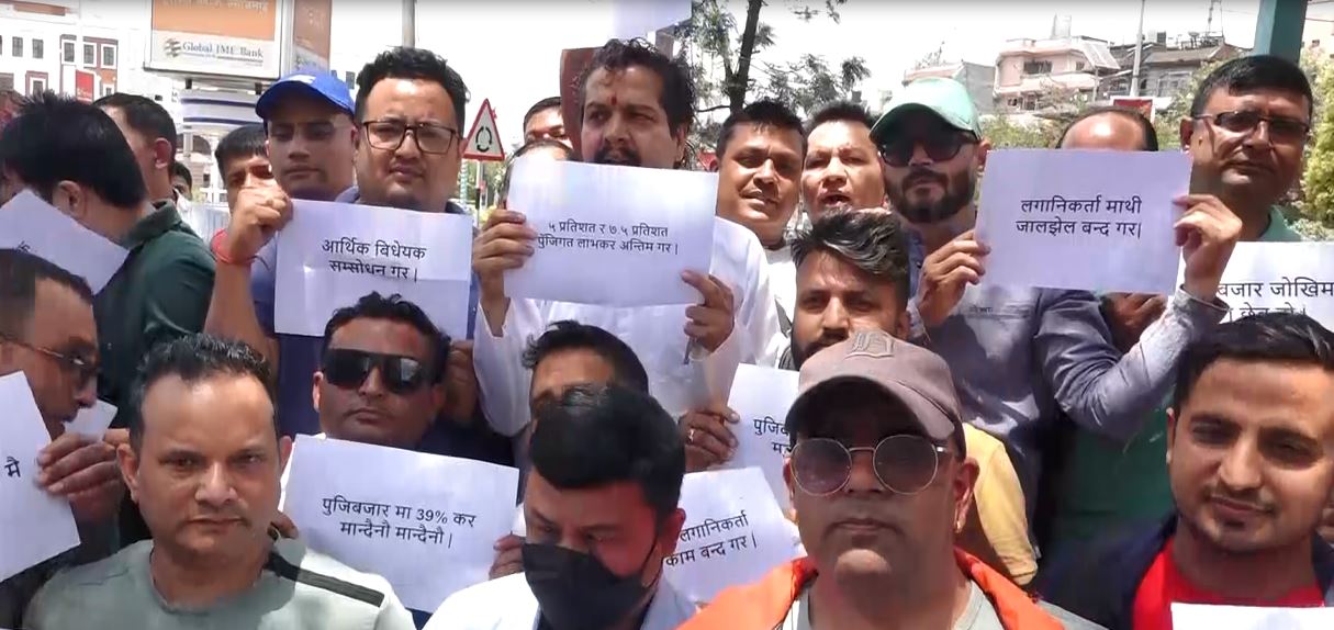 उनीहरुले सेयर कारोबारमा बजेटले गरेको व्यवस्थाप्रति आपत्ती जनाउदै काठमाडौंको माइतिघरमा विरोध प्रदर्शन गरेका हुन् ।