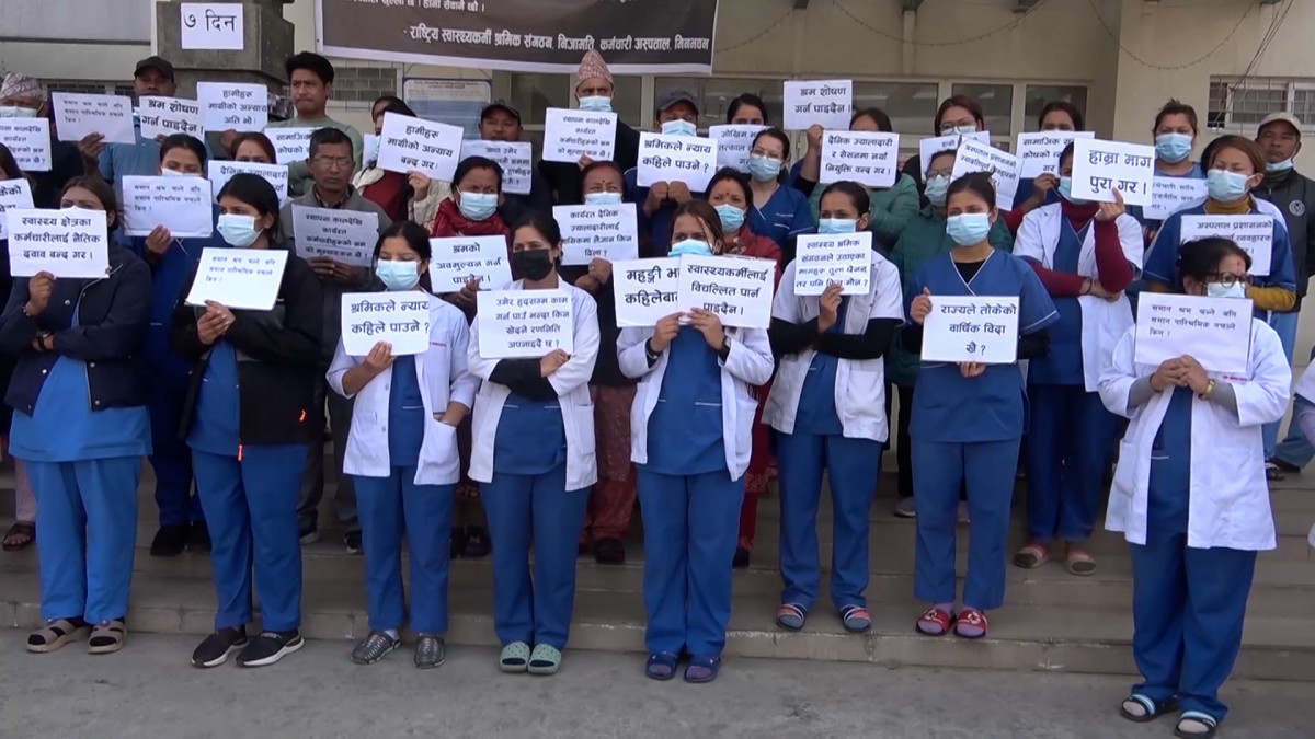 अस्पताल स्थापनाकालदेखि दैनिक ज्यालादारी कर्मचारीको सेवा सुविधा एवं अन्य सेवा सुविधा बढाउन माग गर्दै आन्दोलनमा उत्रिएको राष्ट्रिय स्वास्थ्यकर्मी श्रमिक संगठनका केन्द्रीय अध्यक्ष केशव रोकायाले बताउनु भयो । स्वास्थ्य क्षेत्रको काम सम्मान जनक भएको उल्लेख गर्दै उहाँले सम्मानजनक सेवा सुविधा दिनुपर्ने बताउनु भयो ।
