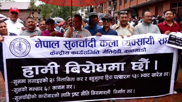 नेपाल सुनचाँदी कला व्यवसायी संघ, काठमाडौं सुनचाँदी व्यवसायी संघ, नेपाल सुनचाँदी व्यवसायी तथा कालीगढ संघर्ष समिति लगतायतले सुनमा लगाइएको दुई प्रतिशत विलासिता कर खारेजीको माग गर्दै प्रदर्शन गरेका छन् ।
