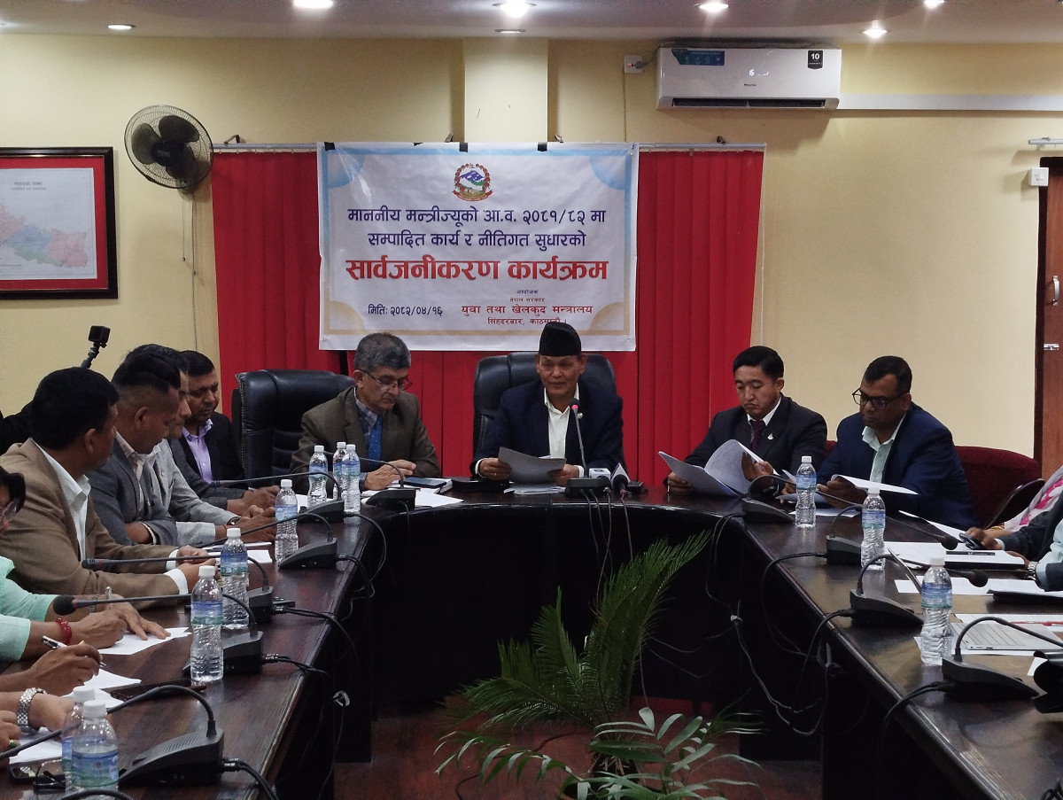मन्त्री चौधरीले नेपाल खेलकुद विज्ञान प्रतिष्ठानको कार्यविधि, २०८२ को मस्यौदा तयारी भएको बताउनु भयो । युवा तथा साना व्यवसायी स्वरोजगार कोषबाट सहकारी संस्थामार्फत युवालाई स्वरोजगार बनाउन प्रवाह गरिएको ऋणमध्ये असुल गर्न बाँकी रहेको ऋण गत आर्थिक वर्षमा १ अर्ब ३१ करोड १४ लाख रुपैयाँ असुल गरेको जानकारी दिनुभयो ।