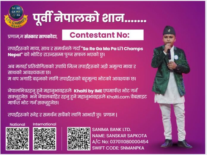 झापा । नेपालको चर्चित गायन रियालिटी सो सारेगमप लिटल च्याम्स सिजन २ को टप ८ मा पर्न सफल संस्कार सापकोटालाई भोट गर्न आग्रह गरिएको छ ।
