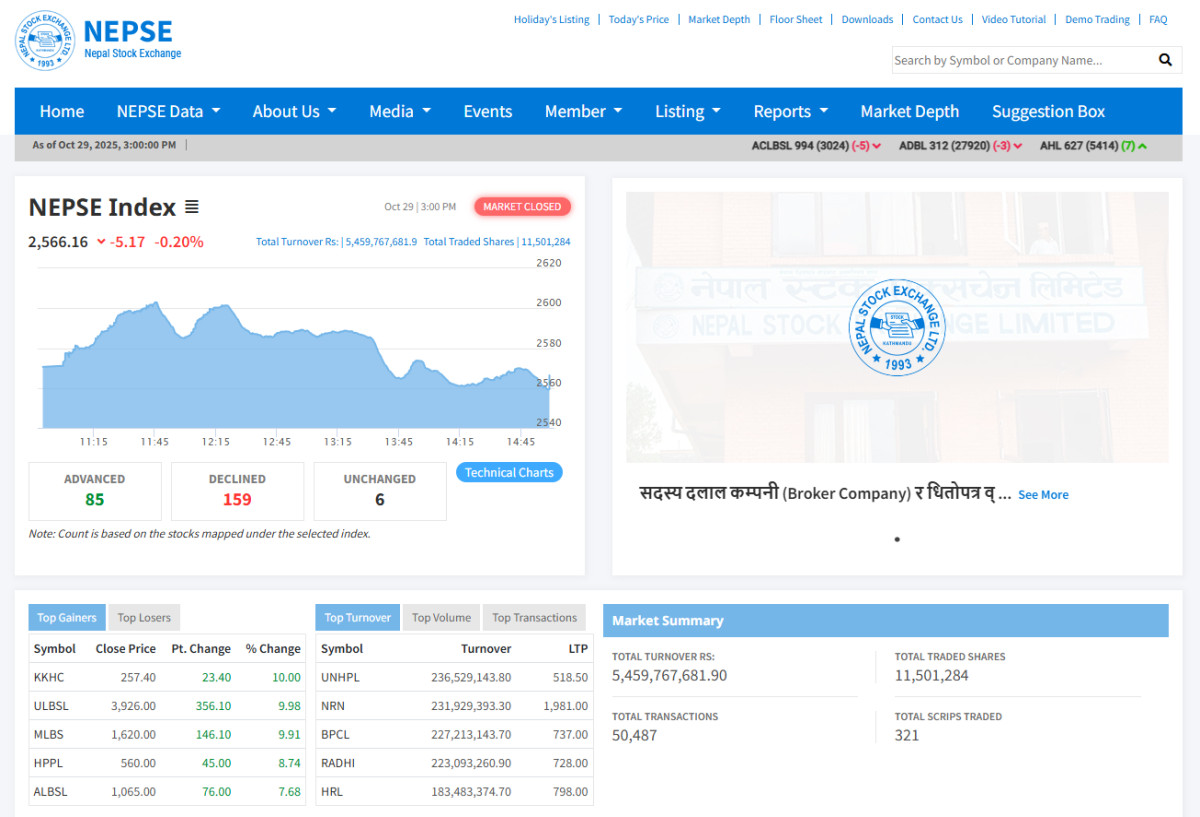काठमाडौं । नेपाल स्टक एक्सचेञ्ज (नेप्से) बुधवार ५ अंकले घटेको छ । बजार बन्द हुँदा नेप्से ५.१७ अंकले घटेको छ । नेप्से ०.२० प्रतिशतले घटेर २५६६ बिन्दुमा परिसूचक पुगेको छ ।