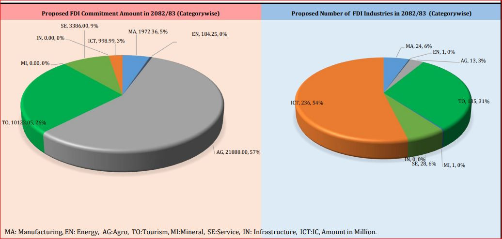 उद्योग विभागले सार्वजनिक गरेको विवरणअनुसार साउनदेखि मंसिरसम्म स्वीकृत भएका परियोजनामार्फत ३८ अर्ब ५९ करोड रुपैयाँभन्दा बढी लगानी प्रतिवद्धता आएको हो । समीक्षा अवधिमा कुल ४ सय ३८ वटा विदेशी लगानीसम्बन्धी परियोजना स्वीकृत भएका छन् । परियोजनाको संख्याका आधारमा सूचना तथा सञ्चार प्रविधि (आईसीटी) क्षेत्र शिर्ष स्थानमा देखिएको छ ।