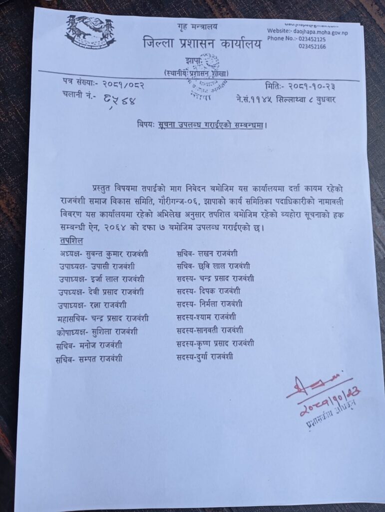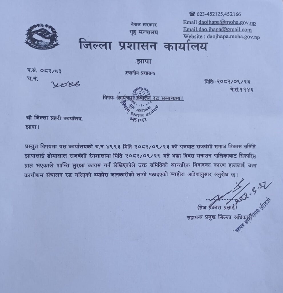 जिल्ला प्रशासन कार्यालय झापाले जिल्ला प्रहरी कार्यालय झापालाई पत्र लेखि अभय राजवंशी केन्द्रीय अध्यक्ष रहेको राजवंशी समाज विकास समिति झापालाई पुस २९ गते नवौं राष्ट्रिय भाक्का दिवस डोमालाल राजवंशी रङ्गशालामा गर्न शान्ती सुरक्षा कायम गर्न पत्र लेखी राजवंशी समाज विकास समितिको आन्तरिक विवादका कारण हाल पुस २९ गते डोमालाल राजवंशी रङ्गशालामा नवौं राष्ट्रिय भाक्का दिवस सञ्चालन रद्द गरिआग्रह गरेकाले त्यसको कार्यान्वयन गर्न राजवंशी समाज विकास समिति झापाका अध्यक्ष उत्तमकुमार राजवंशीले बताए।