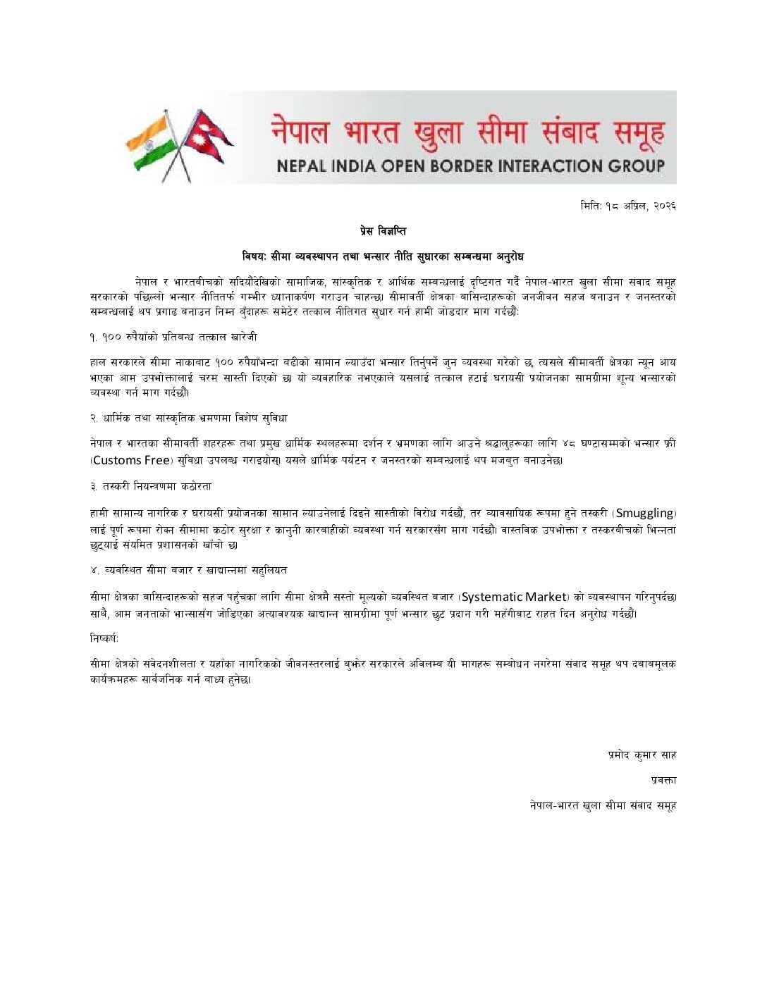 समूहका प्रवक्ता प्रमोद कुमार साहले प्रेस विज्ञप्ति जारी गरी नेपाल र भारतबीचको सदियौंदेखिको सामाजिक, सांस्कृतिक र आर्थिक सम्बन्धलाई दृष्टिगत गर्दै सरकारको पछिल्लो भन्सार नीतितर्फ गम्भीर ध्यानाकर्षण गराएका छन् ।